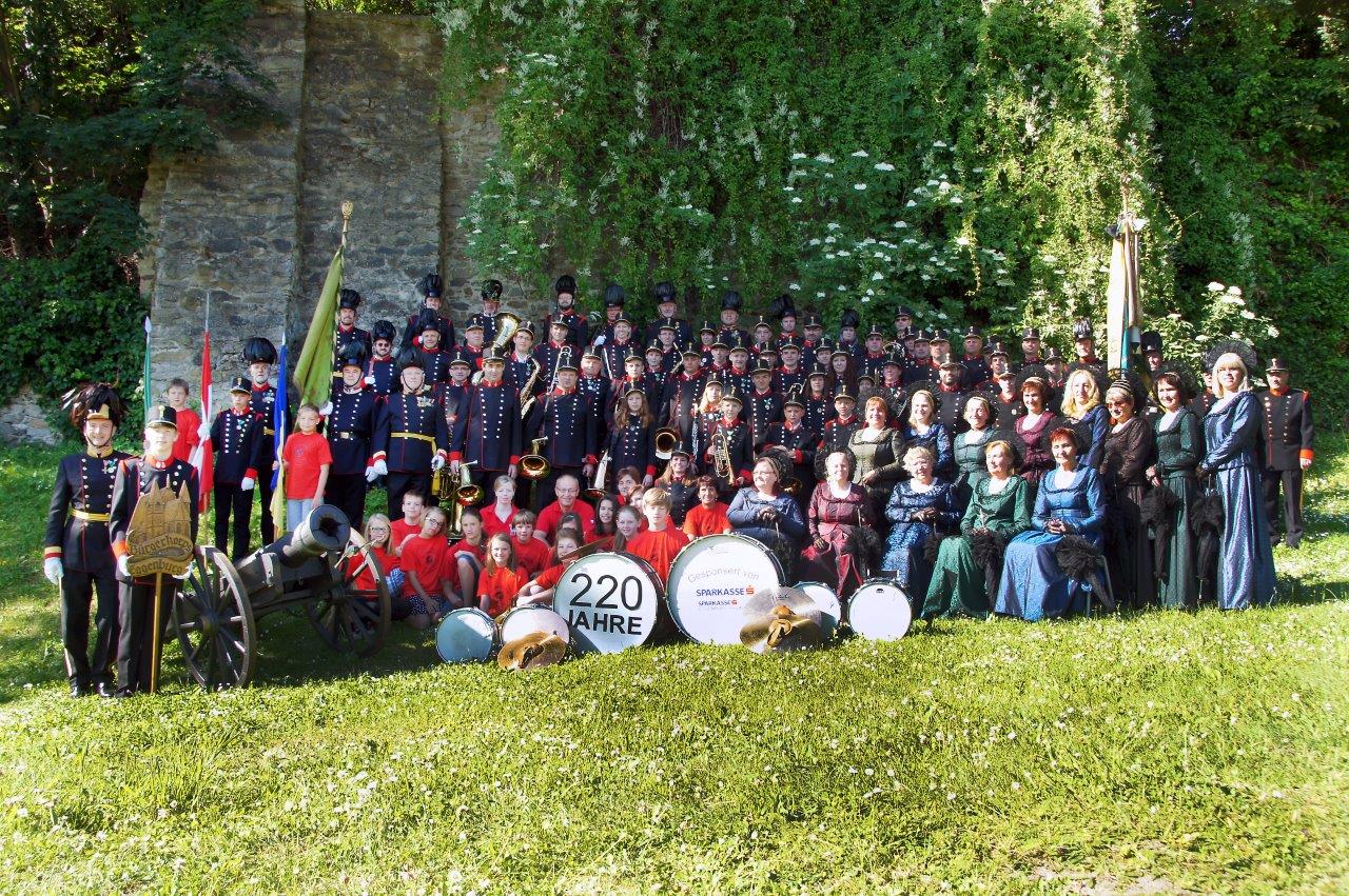 Am Pfingstmontag, dem 9. Juni 1794 fand mit "beigehabter Feldmusik" die Weihe unserer ersten Fahne statt. 1843 wurde unser ältestes noch erhaltenes Instrument angekauft, eine große Trommel. Nach der Auflösung 1938 marschiert seit 1969 wieder der Schützenzug in Uniform und mit Waffen durch die Stadt, seit 1974 gemeinsam mit dem Musikzug. Seit 2003 bringt die Jugendkapelle "Young Spirit" frischen Wind in unsere Reihen. Mit den feschen Ehrendamen mit Bürgerkleidern und Radelhauben stehen über 150 Mitglieder "Treu der Stadt - zur Wehr - zur Ehr´! "